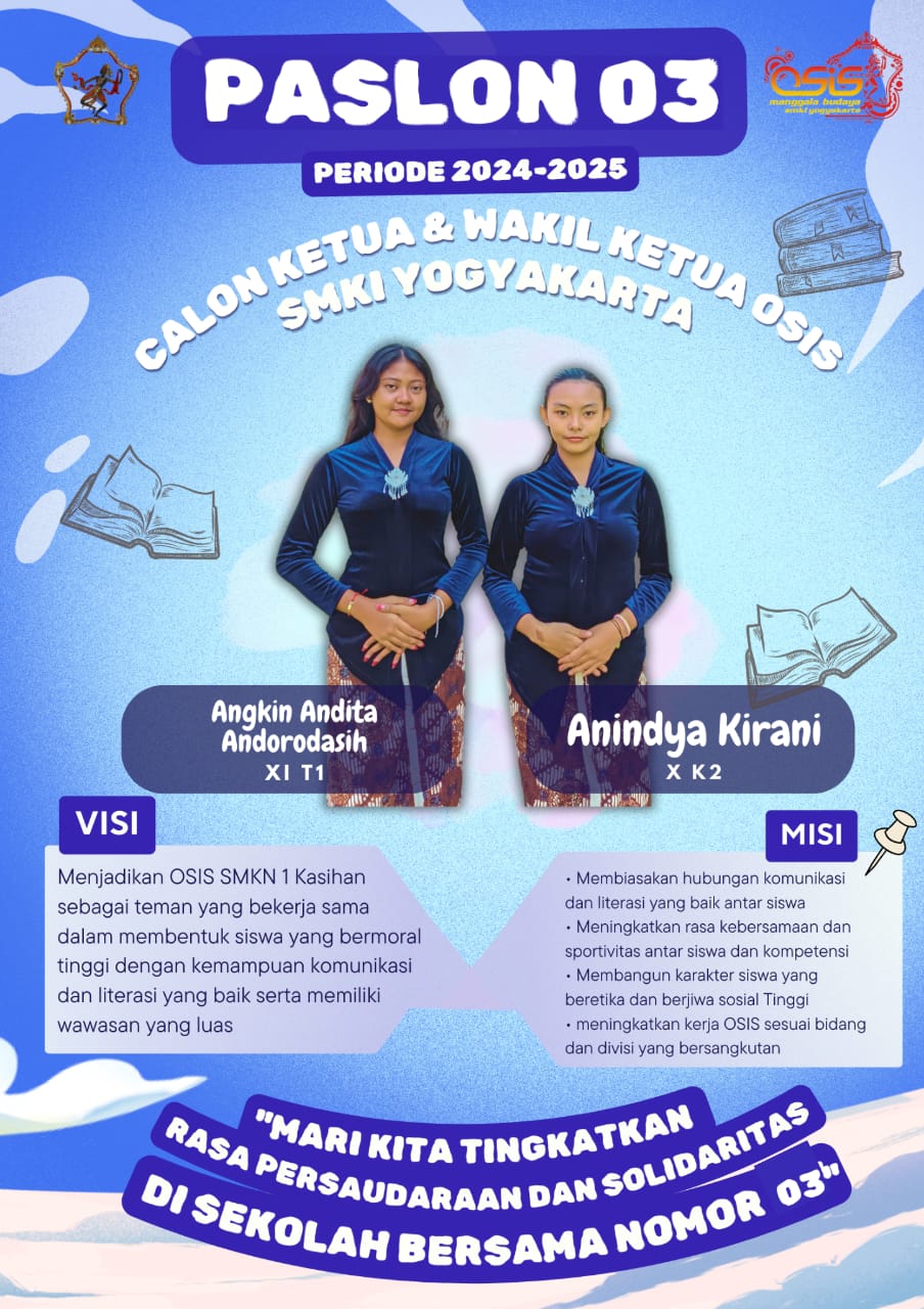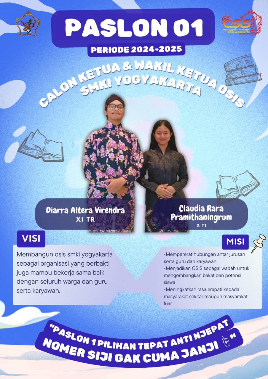 Adapun kandidat Pemilos Periode 2024-2025 yaitu paslon 01 Diarra Altera Virendra dan Claudia Rara Pramithaningrum, Paslon 02 Maria Karlast Bening Nirwasita dan Christian Noval Eka Wibawa, Paslon 03 Angkin Andita Andorodasih dan Anindya Kirani, Paslon 04 Elsinta dan Albyan Azhar Abdillah.