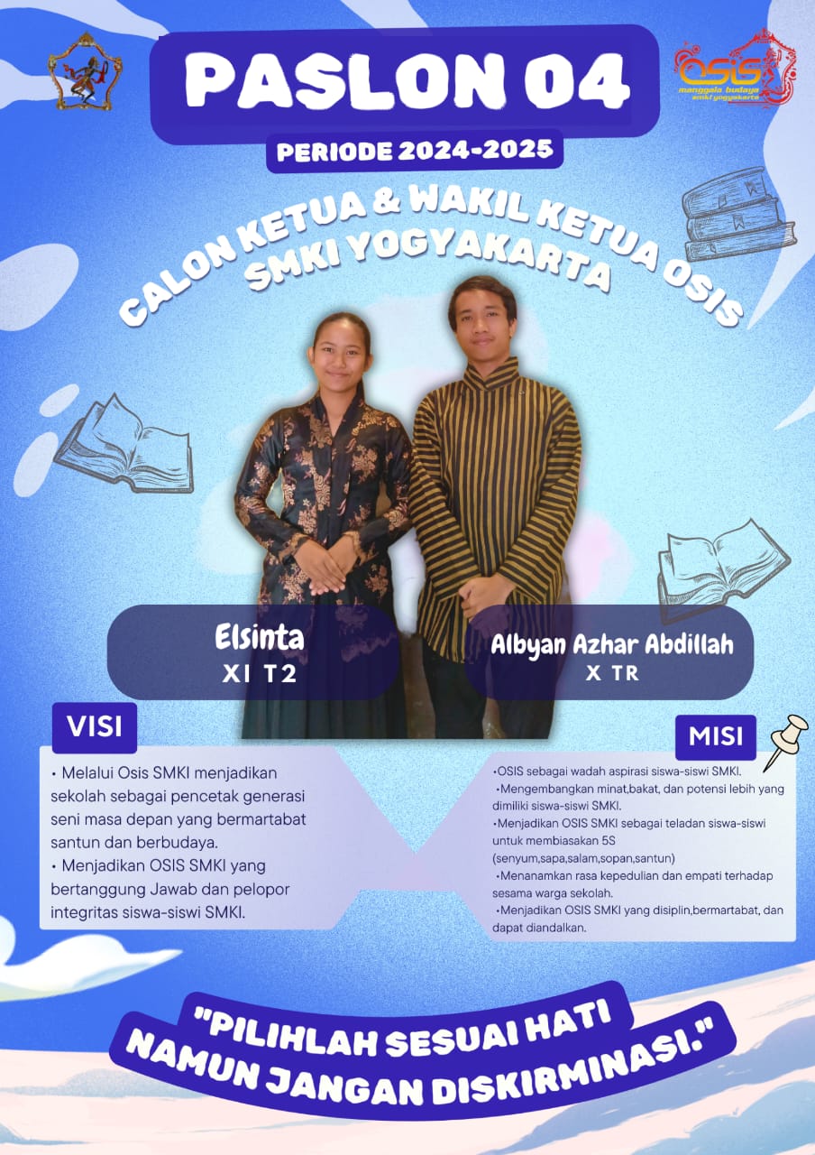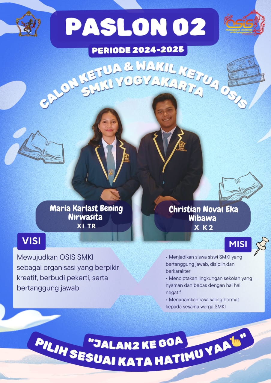 Adapun kandidat Pemilos Periode 2024-2025 yaitu paslon 01 Diarra Altera Virendra dan Claudia Rara Pramithaningrum, Paslon 02 Maria Karlast Bening Nirwasita dan Christian Noval Eka Wibawa, Paslon 03 Angkin Andita Andorodasih dan Anindya Kirani, Paslon 04 Elsinta dan Albyan Azhar Abdillah.